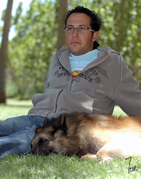 Tranquilos y a la sombra, después del estrés del ring, D. Sergio Martín y Cabila del Segadal, totalmente dormido. Ventajas de tener un ring rodeado de sombras y cesped.