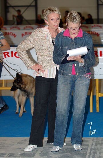 Mme. Marie F. Berton-Sarlat y su Comisario de Ring, Dña. Marina Fano en plena "faena".