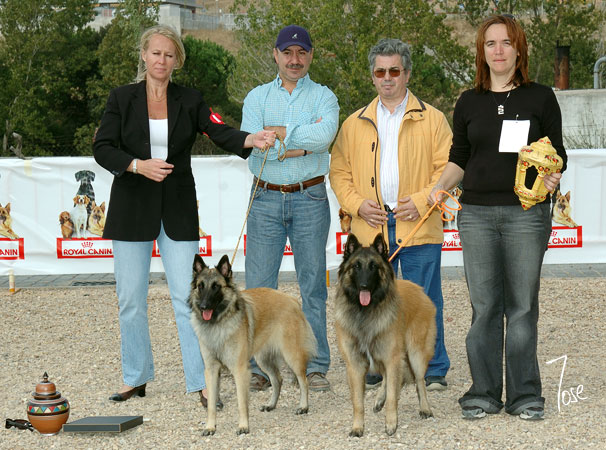 El Juez, D. Miguel A. Casado y el Presidente del Club, D. Tomás Odriozola junto a los Mejores Jóvenes Tervueren, macho y hembra, FIONA y FALKO DE CEIBE LAR