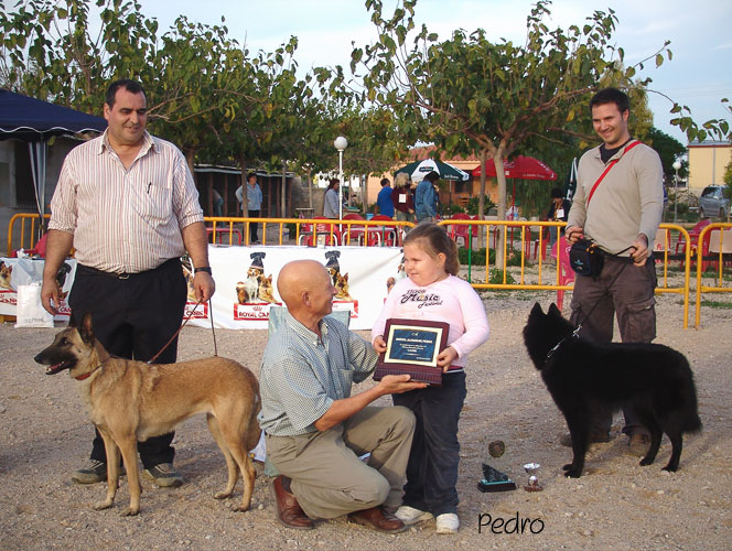 La joven Sara Serrano entrega un detalle al Juez de la prueba D. Miguel Alfageme. Justo detrás aparecen Tessa des Iles du Sud (Mejor Malinois) y la joven hembra Groenendael Bohême de la Valle des Sortileges, Mejor Sujeto Absoluto BIS