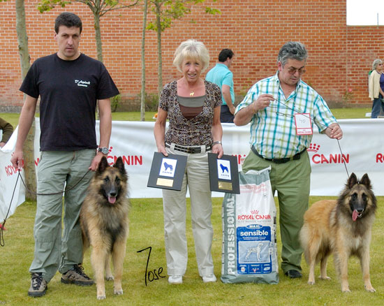 Los dos Tervueren que se alzaron con el CAC: El macho EMIR DE CONDIVICNUM, presentado por su criador y propietario D. Pedro José Serrano y la hembra FAMA DEL ESPEREDO, presentada por D. Tomás Odriozola, junto a Mme. Van Deijl y un saco donado por nuestro patrocinador ROYAL CANIN. |