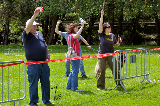 Propietarios llamando a los cuatro sujetos de la Clase Campeones Machos Tervueren en un momento de la clasificación