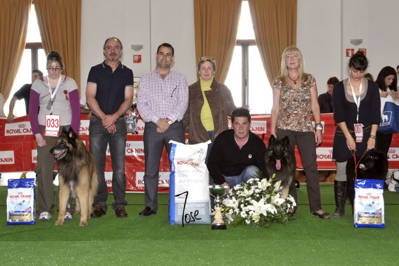 Los tres sujetos que compitieron en el BIS Absoluto: Zule con CABILA del Segadal -Mejor Ch. de Club-, el Juez Miguel A. Casado, Salvador Marcos Nieto -Alcalde de La Campana-, Marina Fano -Presidenta del CEPPB-, Ramiro con IKEN de Pedra Lume -Mejor Tervueren y Mejor Sujeto Absoluto BIS- y Mari Mar con IBELLE de Belliamici -Mejor Groenendael- |