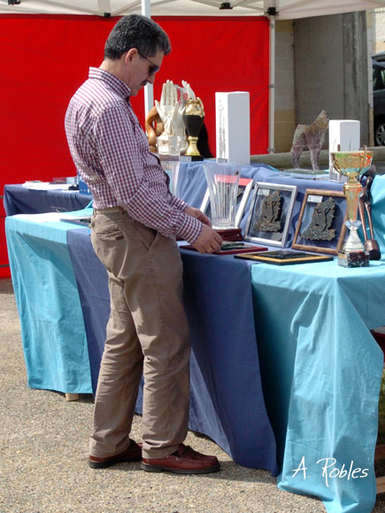 Anibal Robles colocando los trofeos, la mayoría de ellos diseñados y realizados por él mismo