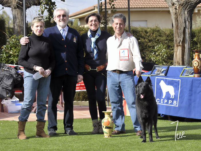 Aguntín Gómez con el Mejor Cachorro, la Hembra Groenendael LIXI CANDY, junto a Marina, Eric y Cuca