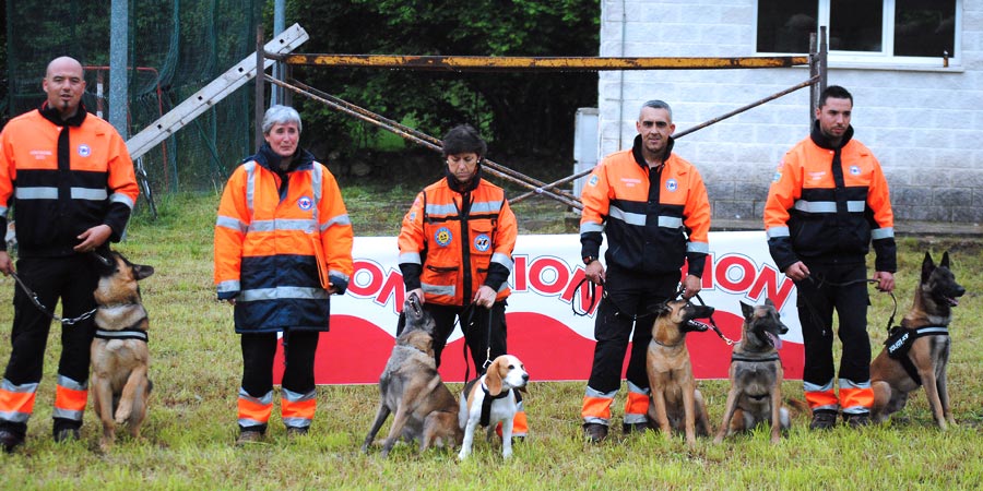 La Unidad Canina de Protección Civil de Cantabria, con Ana San Emeterio (segunda por la izquierda) al frente, que fue acercándonos a los ejercicios con sus comentarios amenos y certeros. Trabajo enorme el de estos perros y sus guías, que generalmente realizan su tarea (recordemos que en juego están con frecuencia vidas humanas) de forma totalmente altruista. (Foto: Agustín Pernía) |