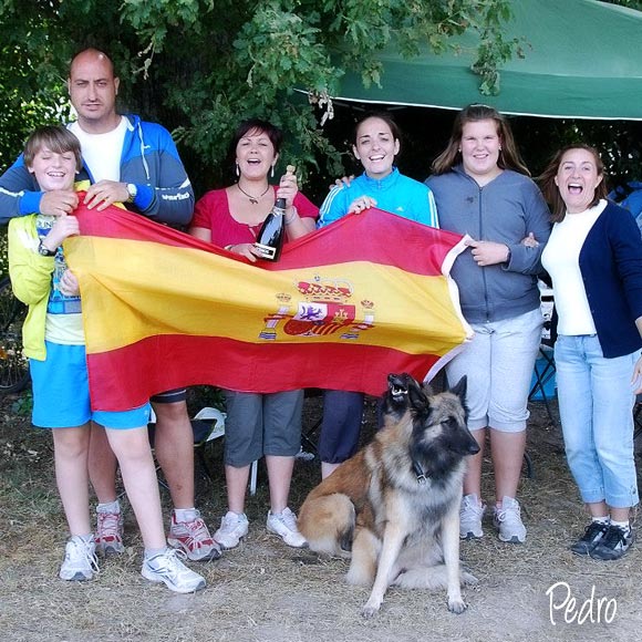 Aficionados espaņoles con la bandera espaņola junto a "Casa Espaņa"
