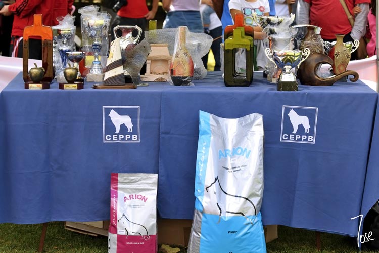 Mesa de trofeos del sábado, con alguno de los productos donados por nuestro patrocinador ARION