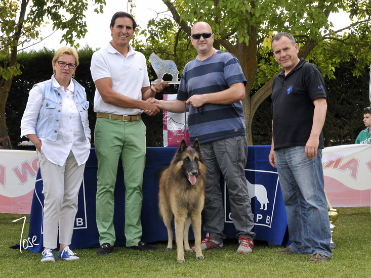 Entrega del Trofeo de Gran Campeón de Club 2014, conseguido por el macho Tervueren Kent d’Aquivelt. Su propietario Manolo recibe el precioso trofeo de manos de Guzmán Gómez, Alcalde de Nava del Rey, en presencia de Marina Fano y Jorge Saucedo respectivamente, Vicepresidenta y Presidente del CEPPB |