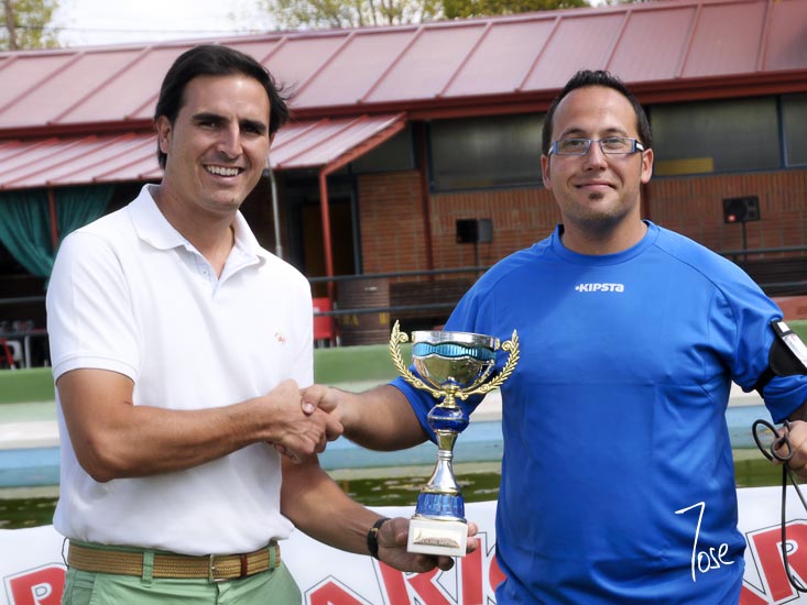 Sergio Martín recibe de manos de Guzmán el trofeo donado por el Ayto. de Nava del Rey al ganador absoluto de la Especial de Cría, la hembra Tervueren Heidi d’Aquivelt