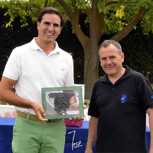 Guzmán Gómez muestra el detalle entregado por Jorge Saucedo en agradecimiento del CEPPB por la excelente colaboración personal suya como Alcalde y del municipio de Nava del Rey por su acogida a los aficionados al Pastor Belga