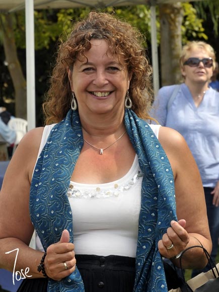 La Juez Pauline Stern-Hanf muestra sonriente uno de los obsequios entregado por el Club