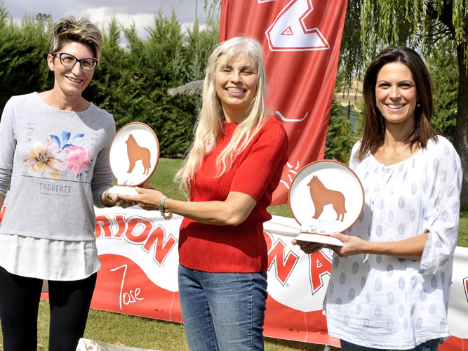 Blanca y María, Concejales de Nava, entregan a Mercedes los Trofeos como Reproductores del Año a sus Groenendael Fredy e Irene de Belliamici
