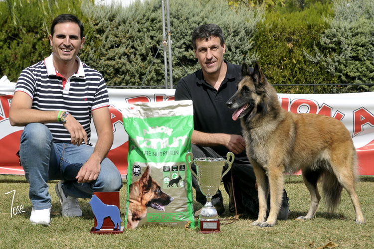 En la foto Guzmán y Pedro posan con Maya d’Aquivelt, Mejor Sujeto BIS con alguno de los trofeos conseguido