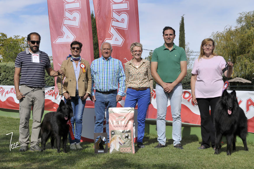 Los Mejores Groenendael: Charli Gil con JADE NOIR DE KOROSTI –Mejor Hembra y Mejor Groenendael-, Blanca Lobera, Guillermo Hernández, Marie F. Berton-Sarlat, Guzmán Gómez y Carmen Blanco con ONIX DE BELLIAMICI –Mejor Macho Groenendael-