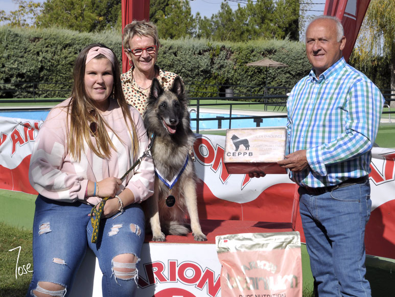 Sara Serrano con la hembra Tervueren HEIDI D’AQUIVELT, Campeona del CEPPB 2017, junto a la juez Marie F. Berton-Sarlat y Guillermo Hernández