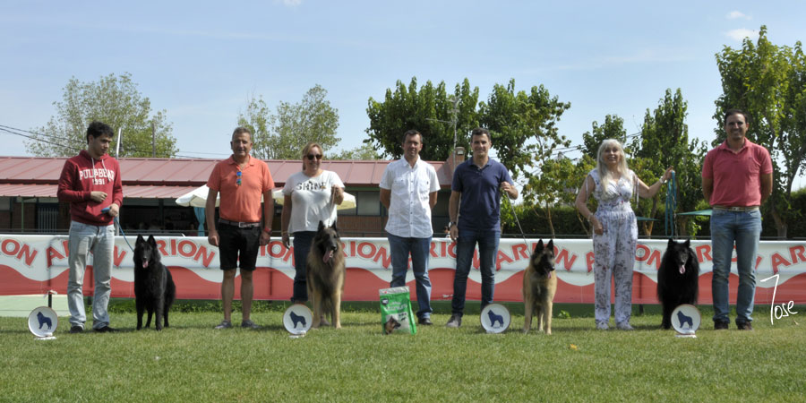 Los Campeones de Club 2018 con sus respectivos trofeos: Jordi con QUEEN de Belliamici, Jaime Concejal del Ayto. de Nava, Alicia con LARK d'Aquivelt, el juez Brice Roise, Angel con MIL AMORES du Bois du Tôt, Mercedes con ORION de Belliamici y Guzmán Gómez, Alcalde de Nava del Rey |