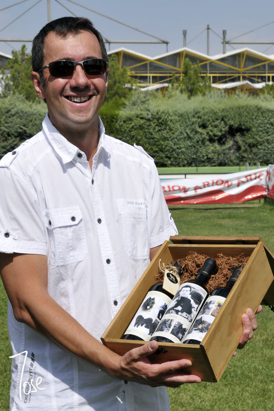 Brice muestra las botellas de vino personalizadas.